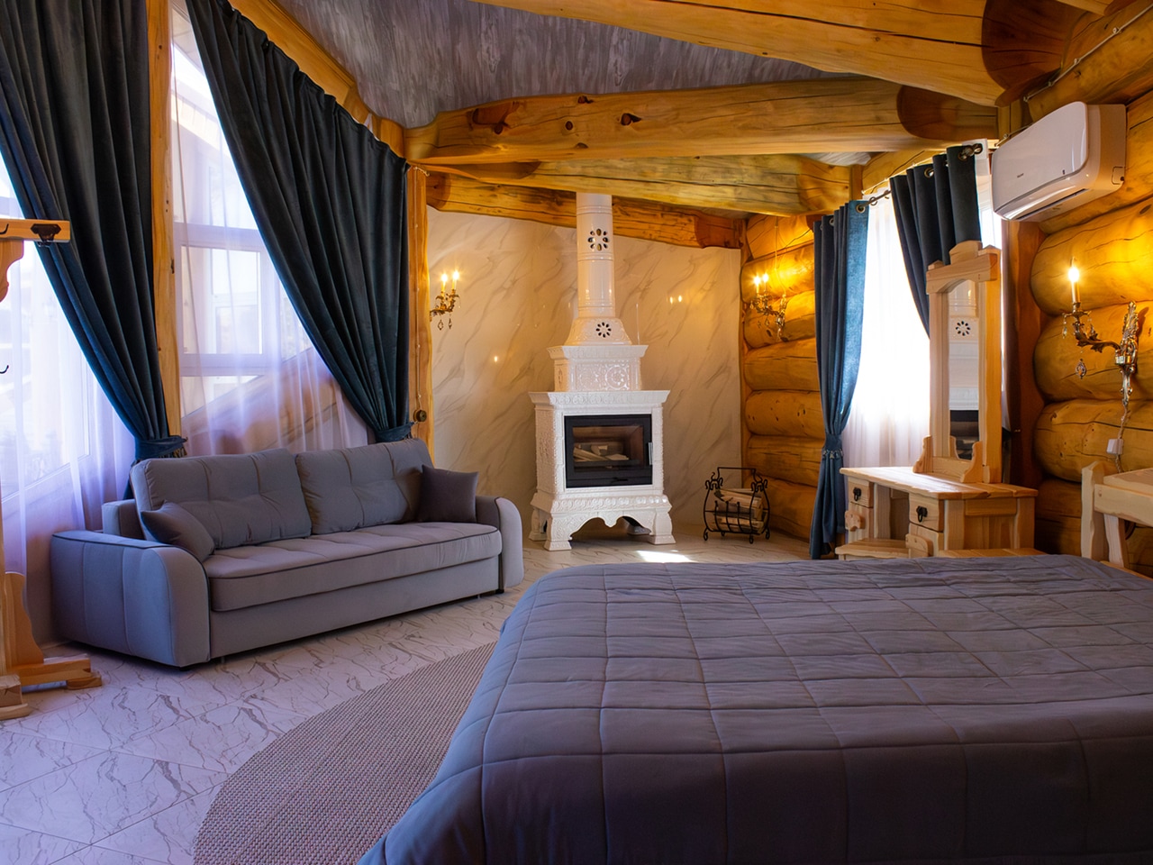 Комплекс рассчитан на компании до 8 человек. Он насчитывает 4 роскошных вип-комнат с двуспальными кроватями и мягкими раскладными диванами, удобными для дневного отдыха и сна.
