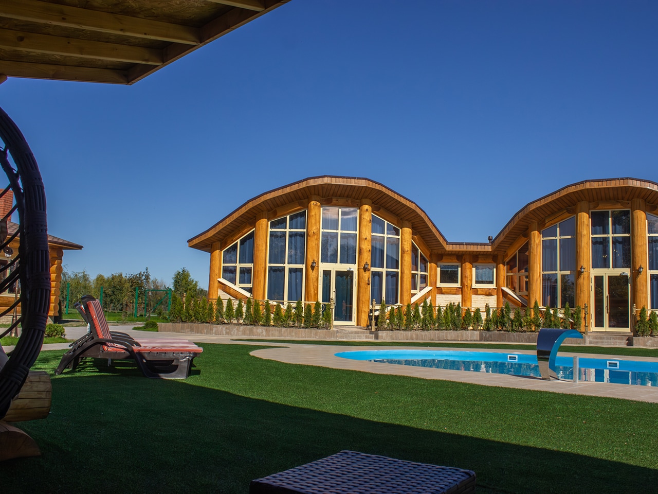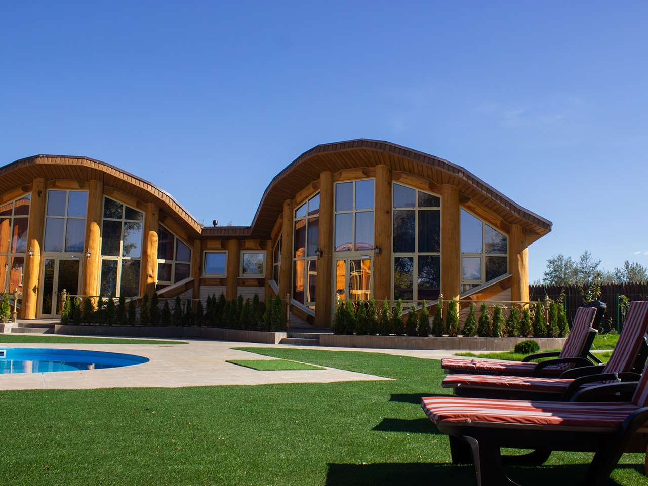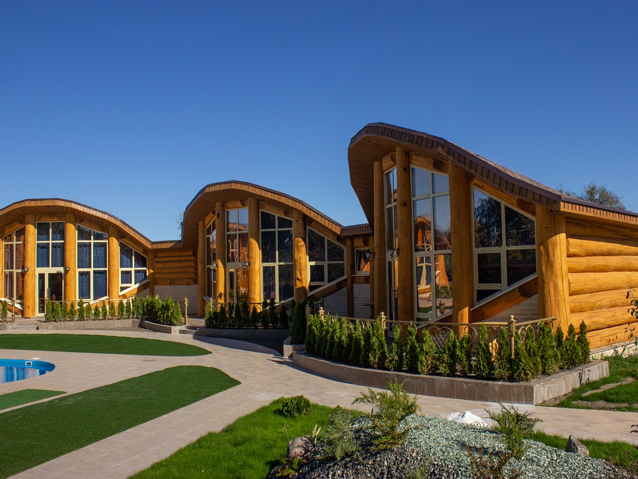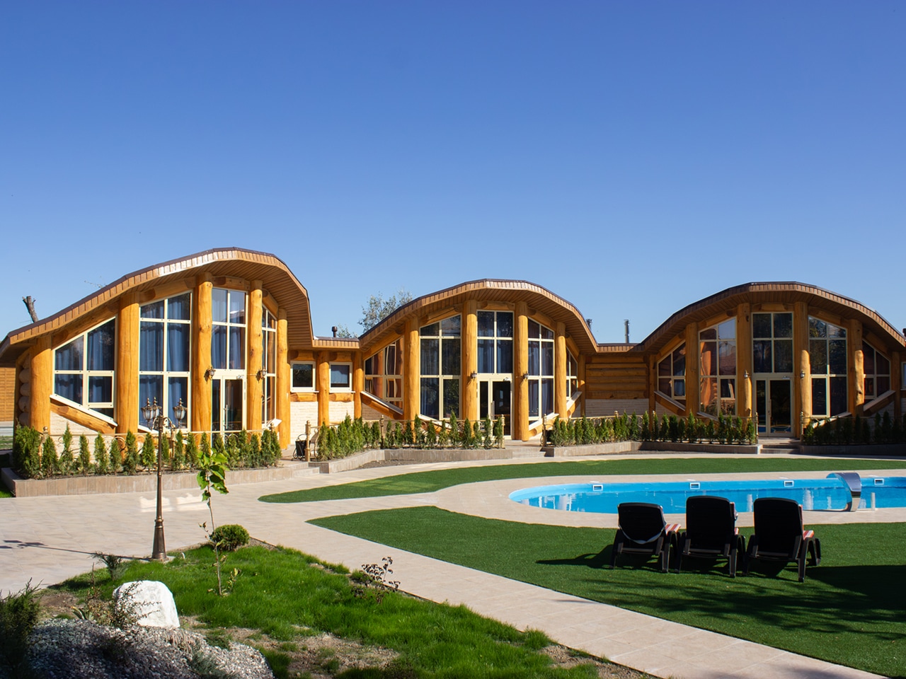 Апартаменты выполнены в виде отдельных кедровых домов с неповторимой аурой, соединенных в единое оригинальное строение. Их большие панорамные окна и двери выходят прямо к бассейну, что особенно актуально в жаркие летние дни.