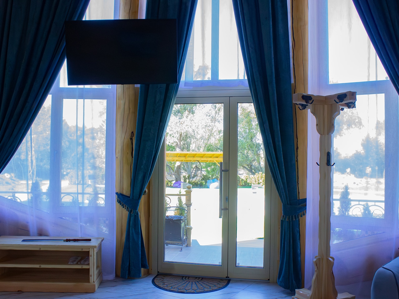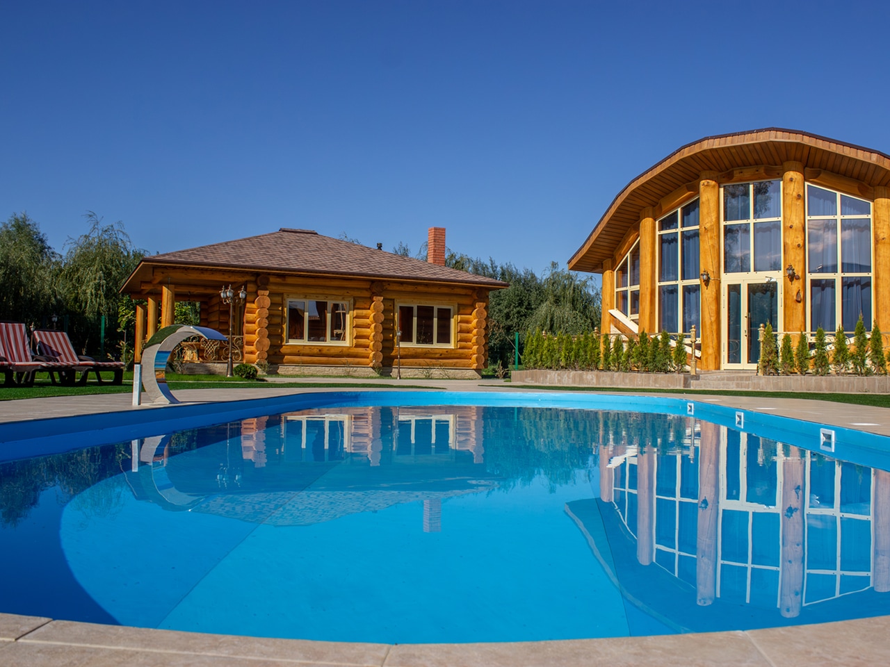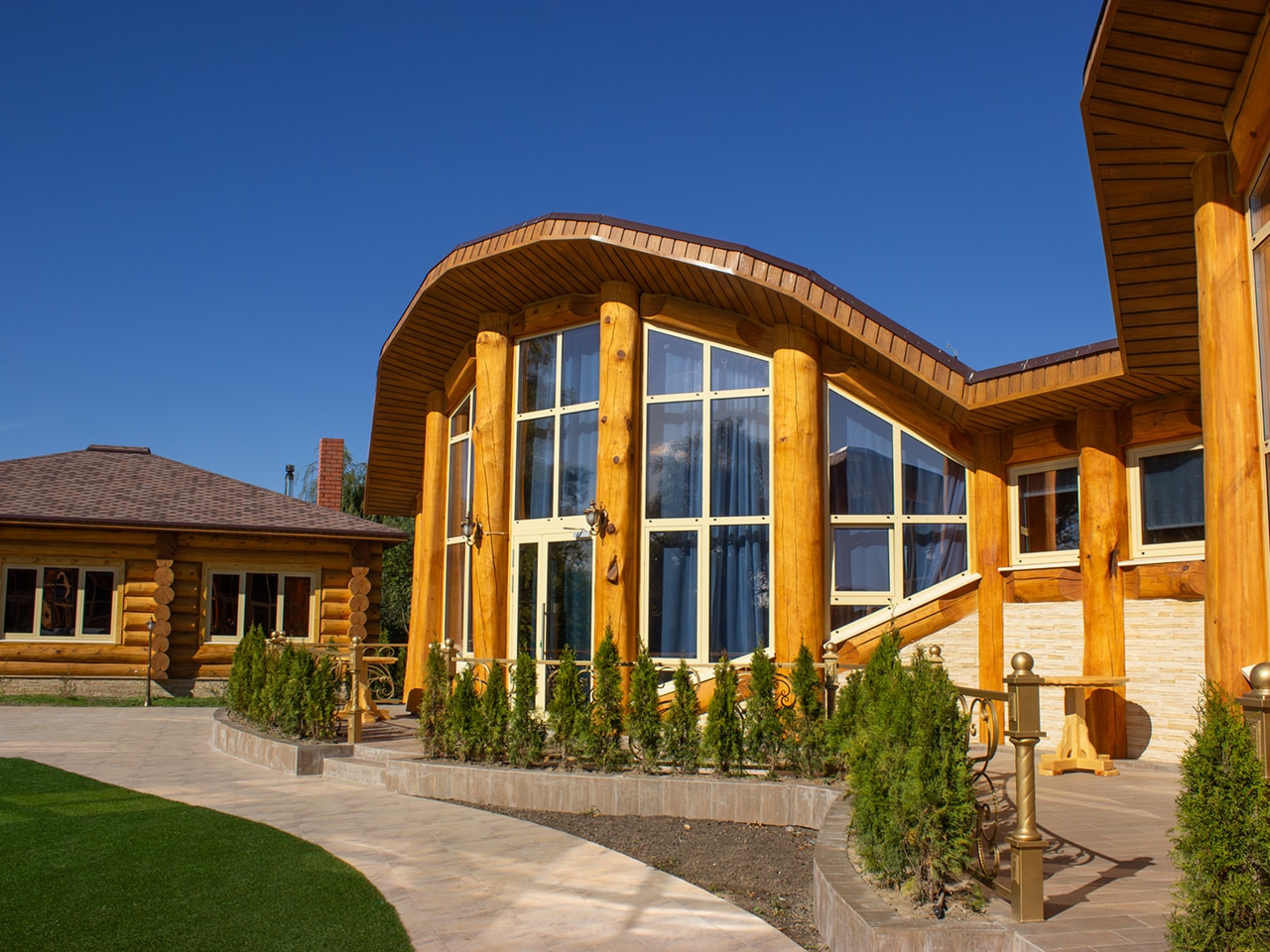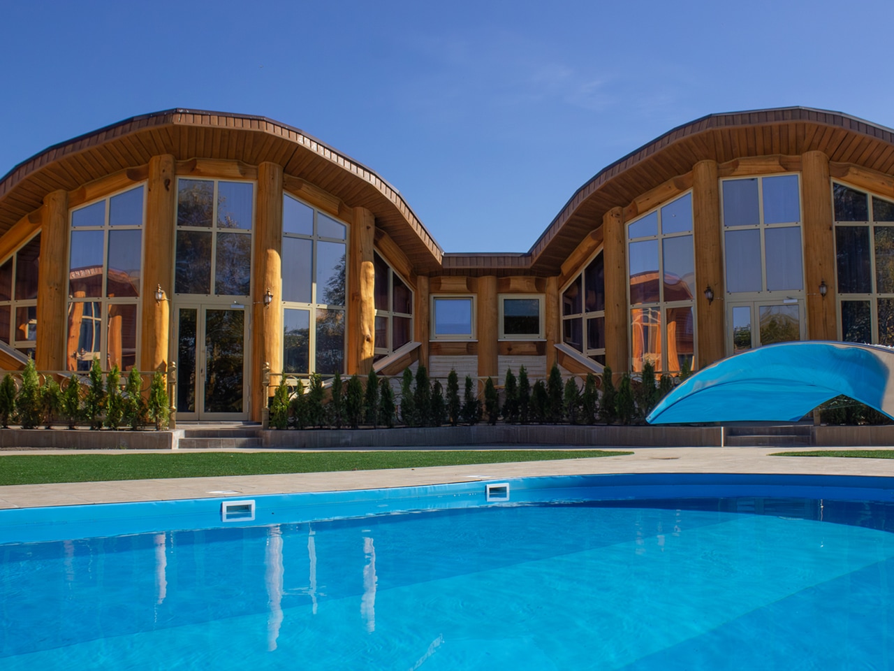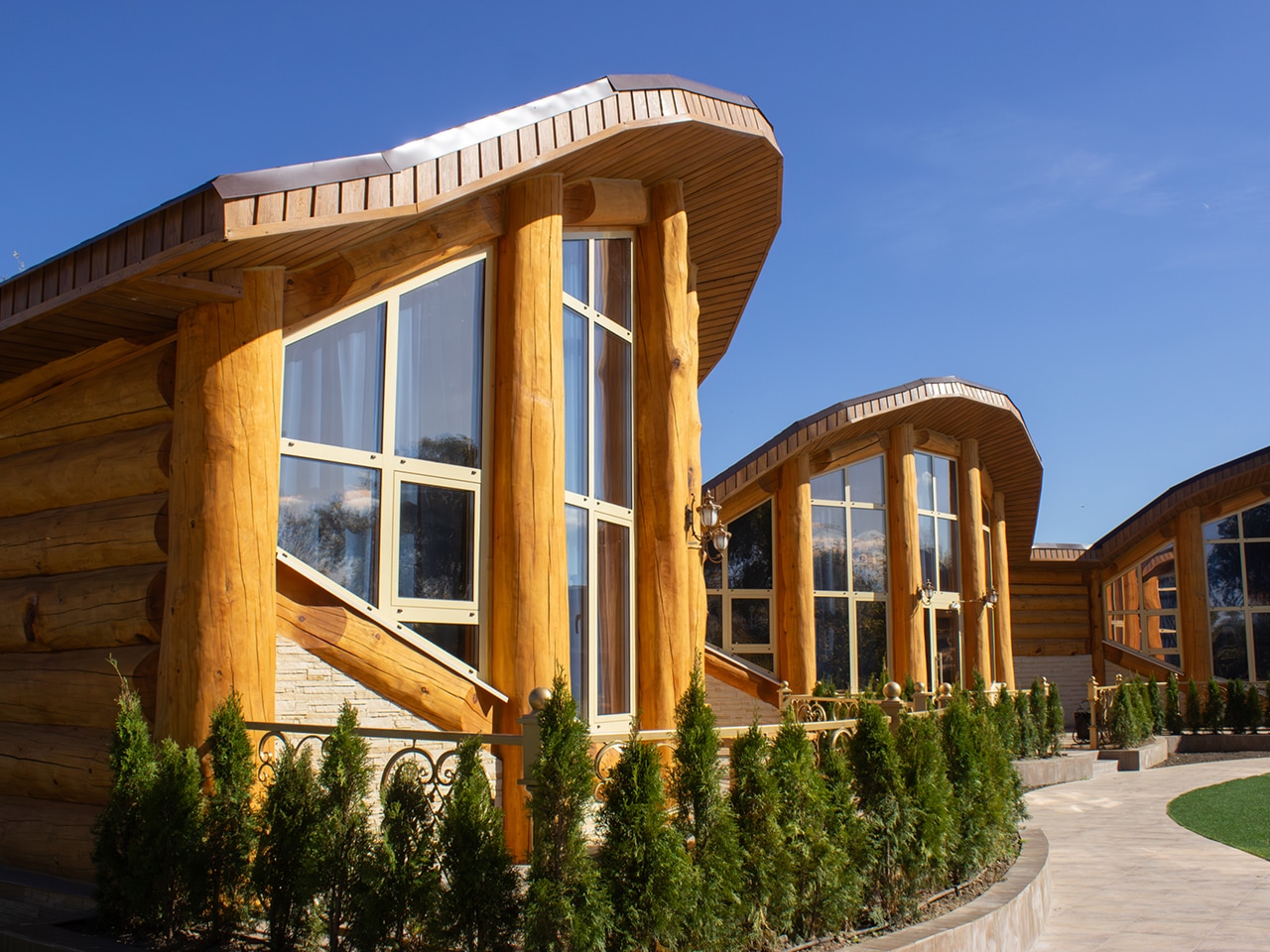 Апартаменты выполнены в виде отдельных кедровых домов с неповторимой аурой, соединенных в единое оригинальное строение. Их большие панорамные окна и двери выходят прямо к бассейну, что особенно актуально в жаркие летние дни.