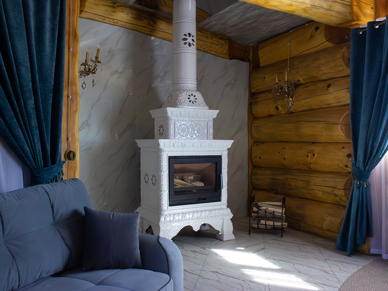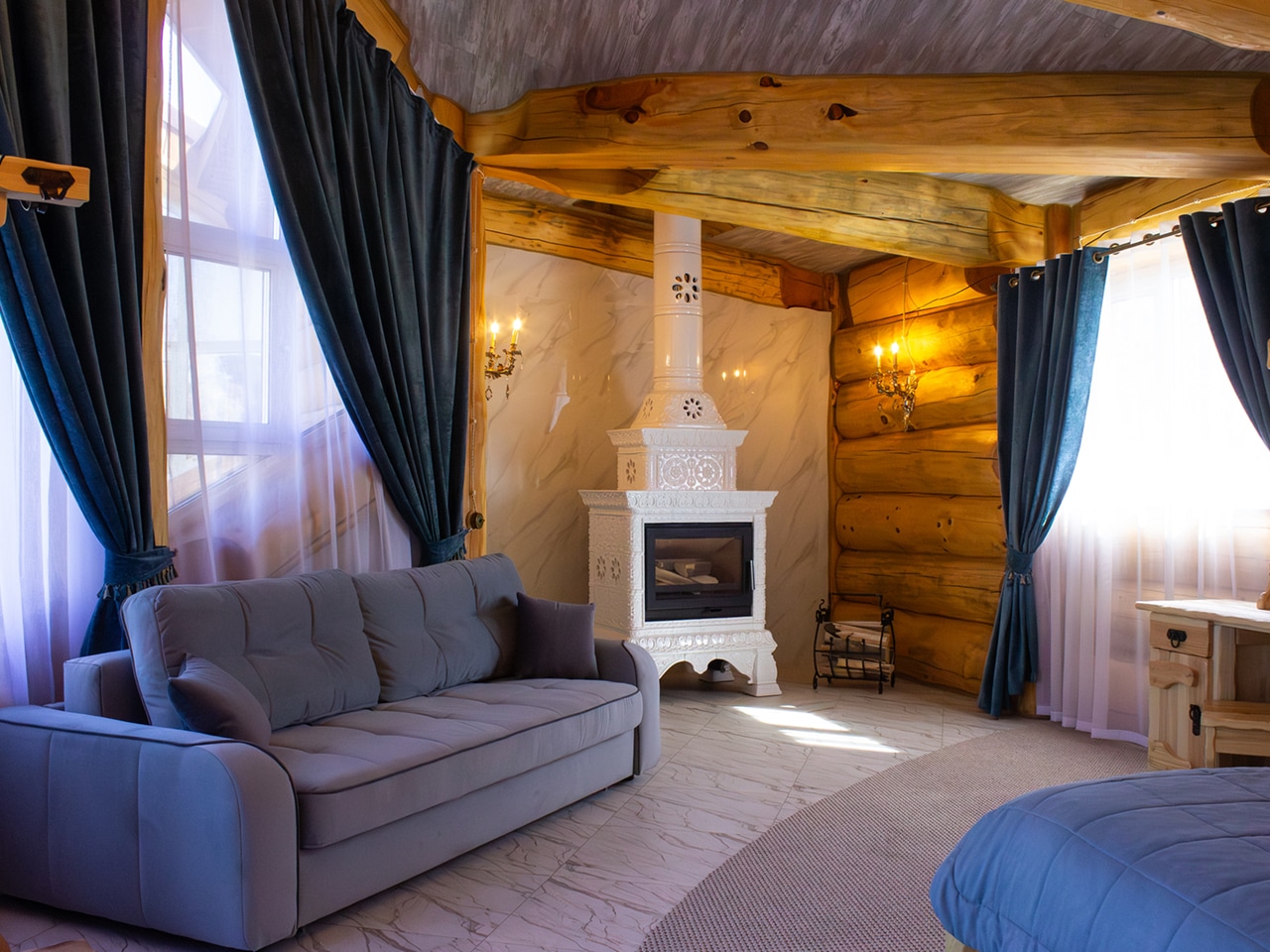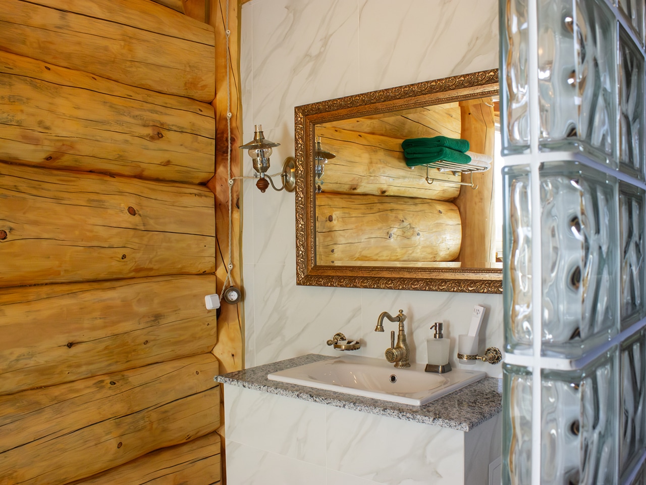В бане есть свои комната отдыха, парилка и душевая с санузлом. В ее интерьере присутствуют все классические атрибуты настоящей русской баньки — дровяной камин, деревянные ковши и лавки, элементы старинного декора.