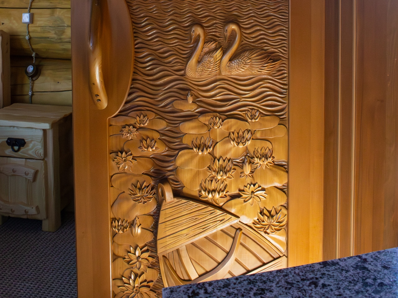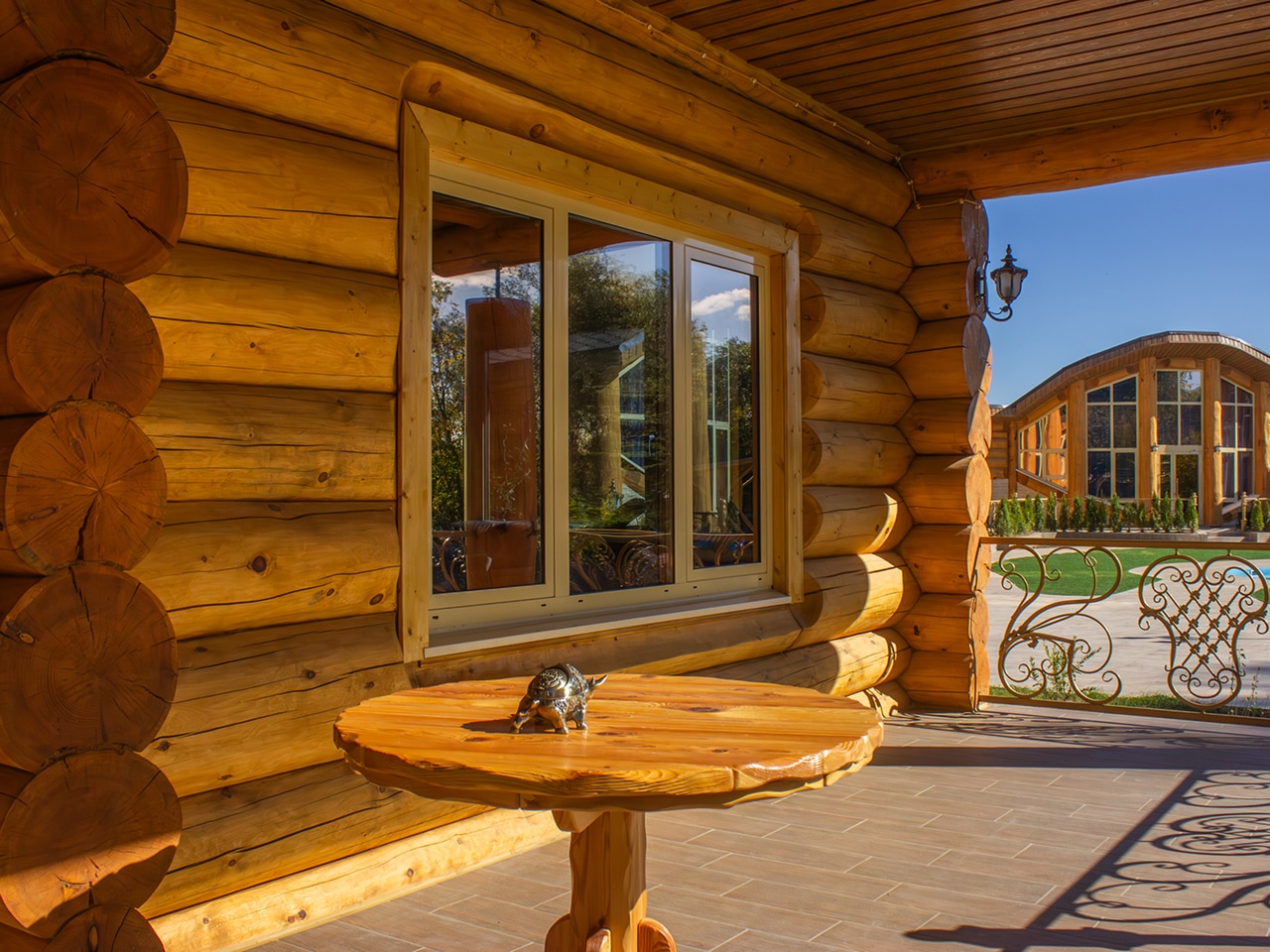 Отдельного внимания в комплексе заслуживает баня. Она состоит из нескольких помещений и кухни, выдержанных в одном стиле и обставленных шикарной деревянной мебелью ручной работы.