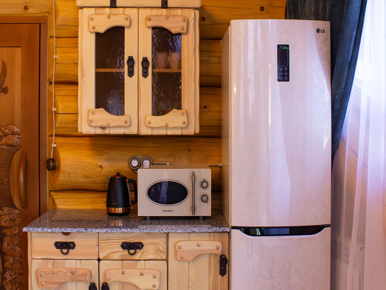 Кухня имеет большой встроенный мангал и аутентичную печь для готовки блюд в казане, всю необходимую бытовую технику для удобного приготовления и хранения пищи.
