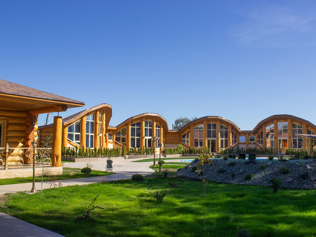 Современный архитектурный ансамбль, гармонично сочетающий современные решения и тёплые мотивы народного стиля, расположился в одном из самых живописных уголков Астраханского края. Стены зданий выложены из массивного кедрового сруба, а панорамные стеклянные фасады открывают вдохновляющие виды на территорию базы и наполняют интерьеры мягким солнечным светом, создавая атмосферу уюта и гармонии.
